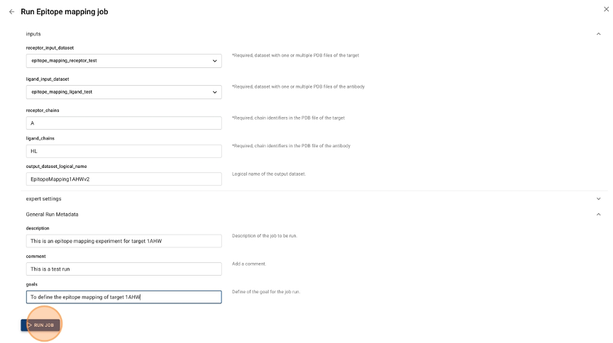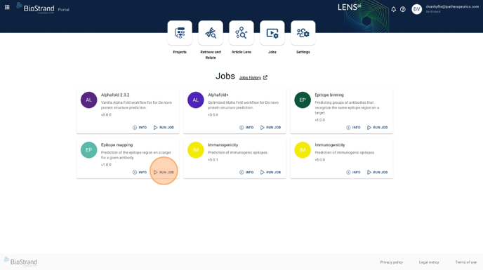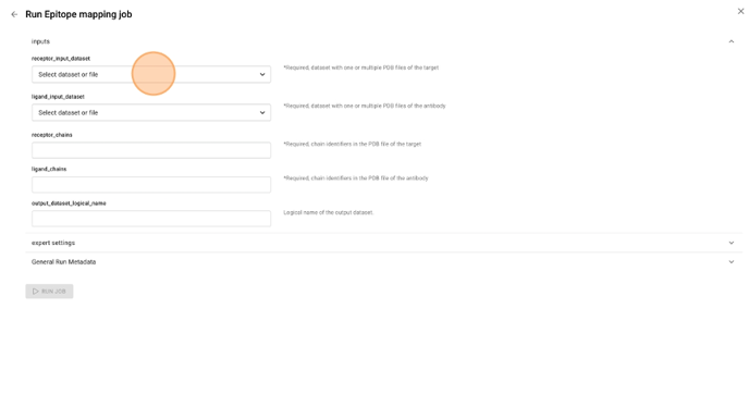Overview of the steps required to launch the Epitope Mapping job and where to retrieve the results.